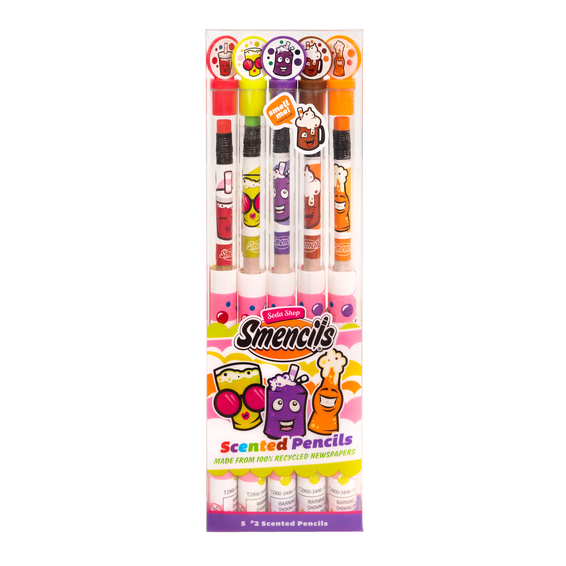 Includes 5 scented HB #2 graphite pencils, each packaged in its own recyclable freshness tube with collectible character top cap.